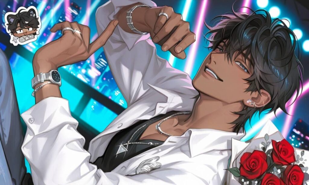 黒と紫の髪が灯りに溶け、静かな夜のような存在感。